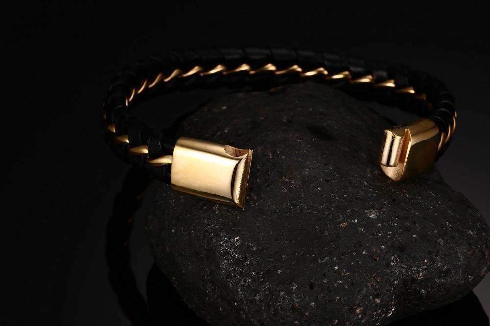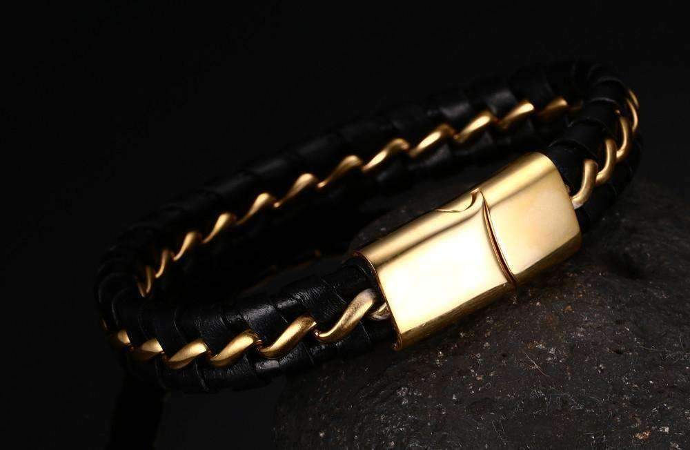 Add a touch of elegance to any outfit by trying this new Dark Knight Leather Bracelet. It features a Gold Plated Steel middle strap that is sandwiched between two other intricately-made straps crafted from Genuine Leather. Aside from that, the Dark Knight also has a very comfortable yet Toggle-clasps made of extremely durable Stainless Steel. It has a length of 20-21 cm and is available for free shipping WORLDWIDE.