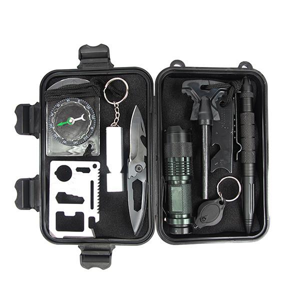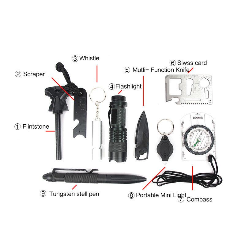 10 in 1 multi-professional emergency survival kits. Containing : Flint stone, Scraper, Flashlight, Swiss Card, Portable Mini Light, Compass, Multi-Function Knife, Whistle, Tungsten Steel Pen, and black sturdy box.