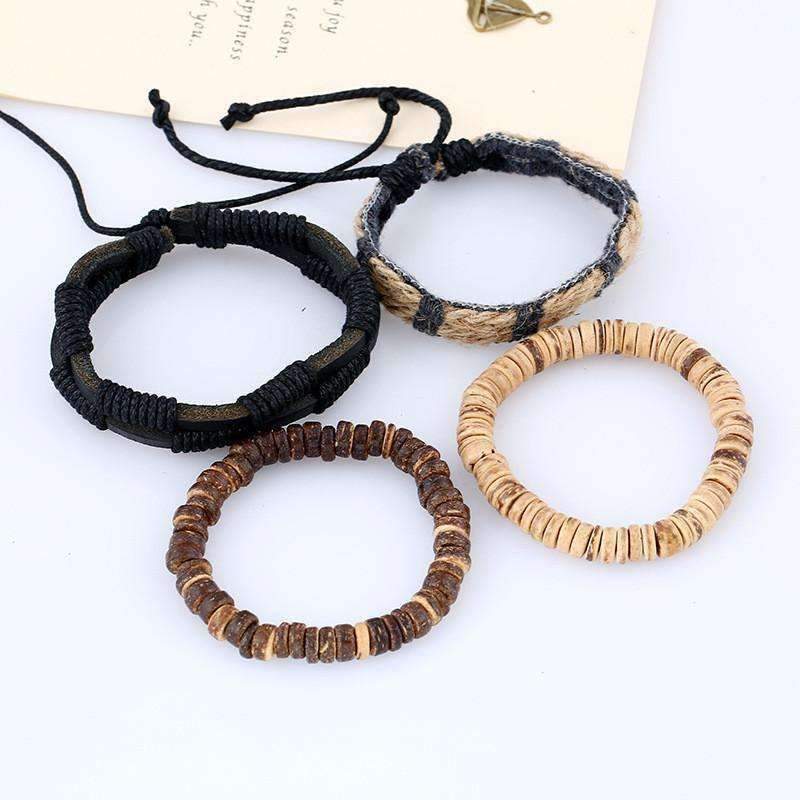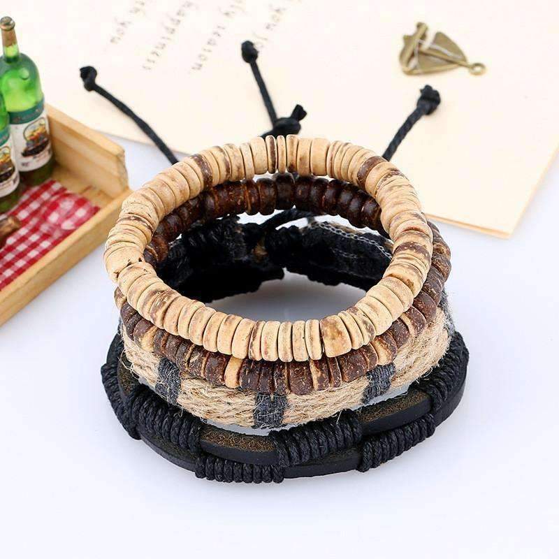 The Coconut Leather Stacked Bracelet features an array of different colored coconut beads that are stacked on-top of a vintage, genuine leather roping. Then, the genuine leather roping is handsomely stacked ontop of a harder &