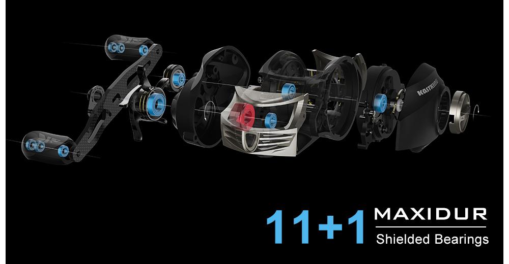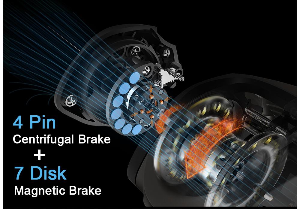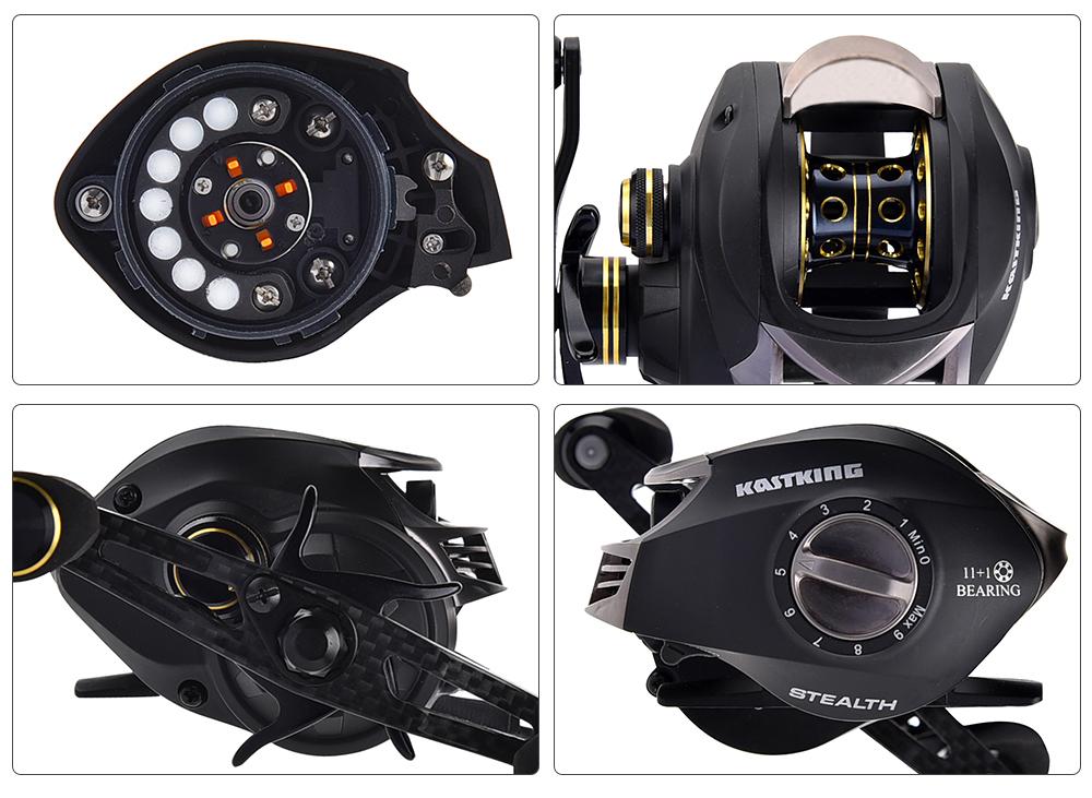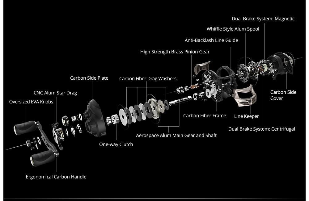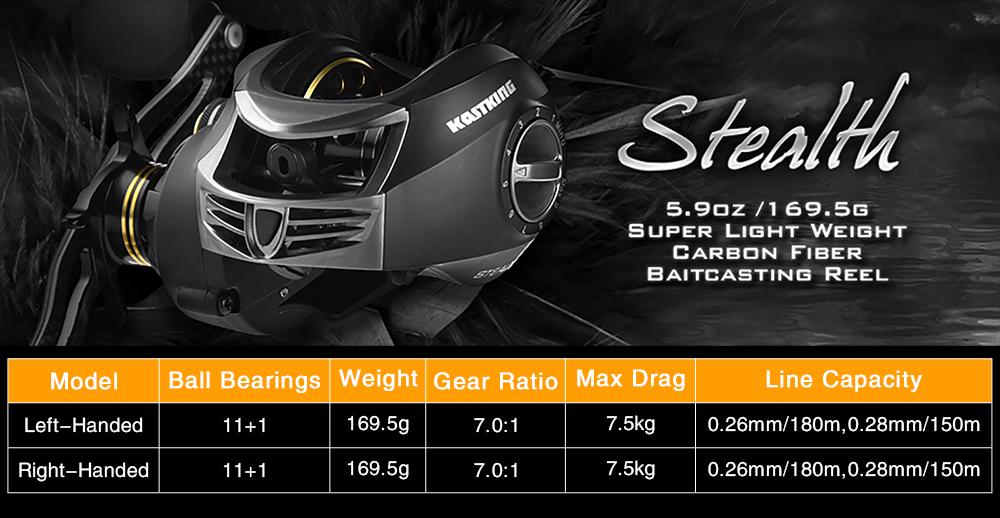 Stealth is made with the same carbon fiber technology, which is stronger and lighter than steel or aluminum used in aerospace, military aircraft, and extreme performance racecar manufacturing. This low profile baitcaster is durable in every aspect with : 4 disk carbon fiber drag system with 16.5 lbs. / 7.5 kg of trophy fish stopping drag, 11+1 high performance anti-corrosion deep-race bearings, braid line ready ceramic guide insert, and a unique industry-leading 7 magnet backlash reducing magnetic braking system match with a fully adjustable 4-pin long standing centrifugal brake for ultimate cast control. It tips the scales at a mere 6 ounces for extended fishing comfort combined with jet fighter performance